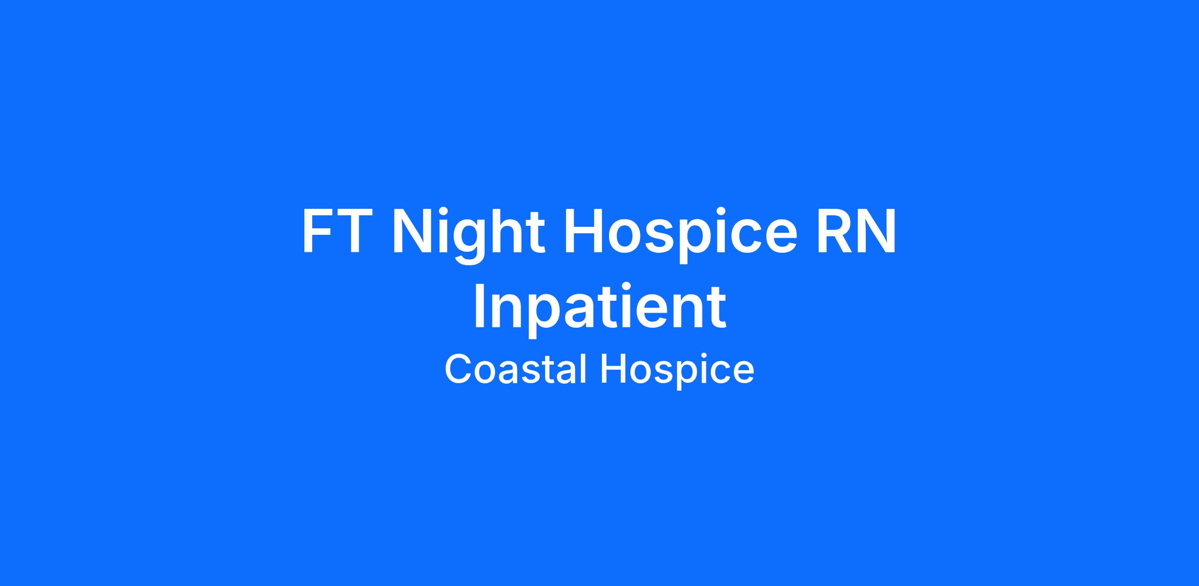 DescriptionCoastal Hospice invites you to join a team of caregivers who are committed to promoting dignity and quality of life for patients and families who face life-limiting conditions. In your role as a _FT Night Hospice RN Inpatient___, you will help ensure that every patient and family is honored, supported and comforted as they receive the right care at the right time throughout their journey by: