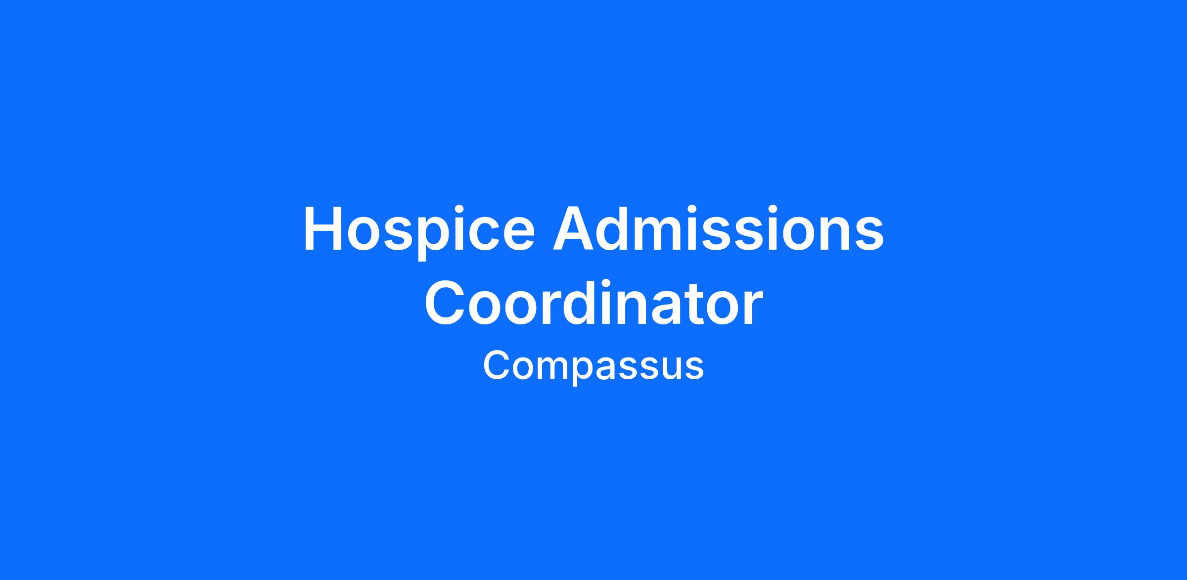 The Hospice Admissions Coordinator is responsible for modeling the Compassus values of Compassion, Integrity, Excellence, Teamwork, and Innovation and for promoting the Compassus philosophy, using the 6 Pillars of Success as the foundation. S/he is responsible for upholding the Code of Ethical Conduct and for promoting positive working relationships within the company, among all departments, and all external stakeholders. The Hospice Admissions Coordinator processes patient referrals, coordinates the admission of patients, and enters patient admission data after all requirements of hospice have been met.