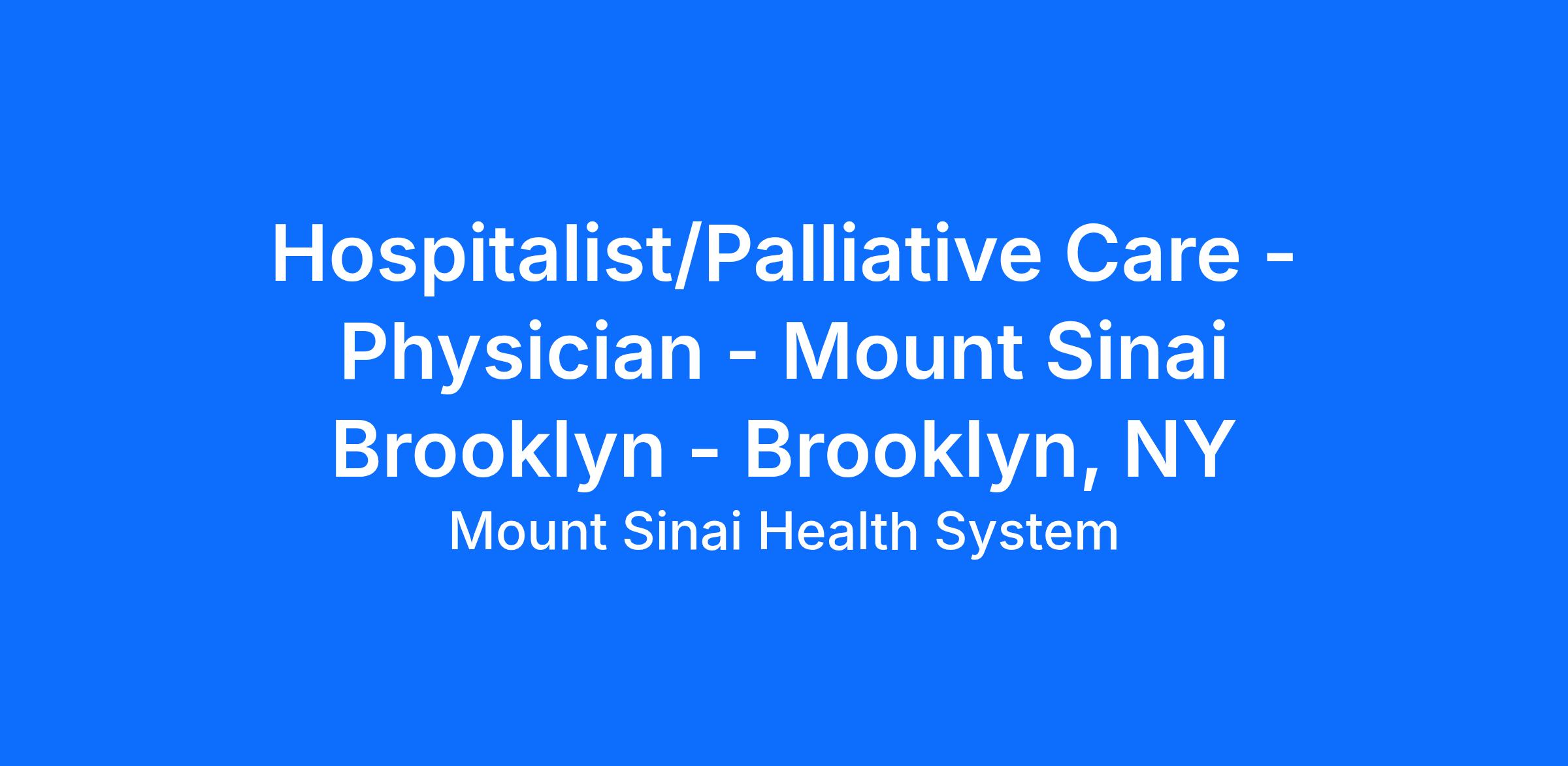 Mount Sinai Brooklyn seeks a Hospitalist/Palliative Care Physician to care for patients admitted to the Medical Service.