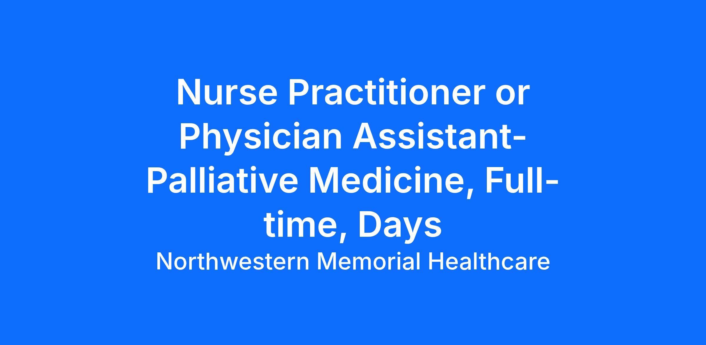 Northwestern Medicine has an exciting opportunity for either a Nurse Practitioner or a Physician Assistant to work in our Palliative Medicine Department. This position will be a mix of ambulatory and inpatient.