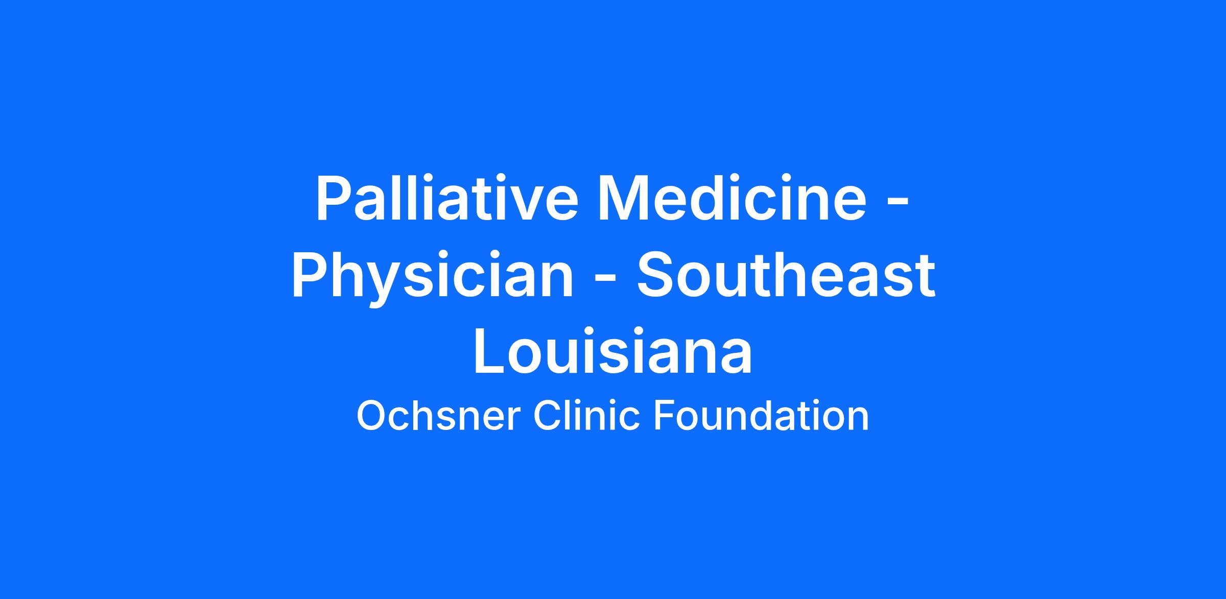 Ochsner Health is seeking a Board Certified/Board Eligible Palliative Medicine Physician. Ochsner Health is an integrated healthcare system with more than 36,000 employees and over 4,600 employed and affiliated physicians in over 90 medical specialties and subspecialties. It operates 47 hospitals and more than 370 health and urgent care centers across Louisiana, Mississippi, Alabama and the Gulf South.Position Highlights: