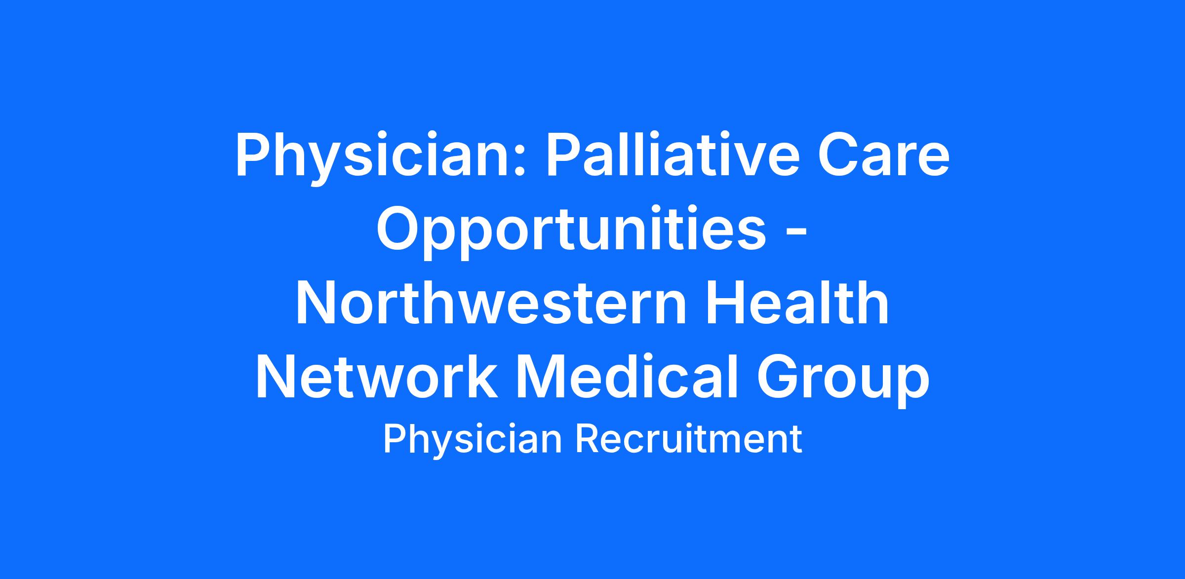 Northwestern Medicine is expanding its Palliative Care program across health network locations throughout the Chicago suburbs. We are seeking compassionate, innovative physicians to be part of this ambitious initiative to expand what is already the premier Palliative Medicine program in Chicagoland.