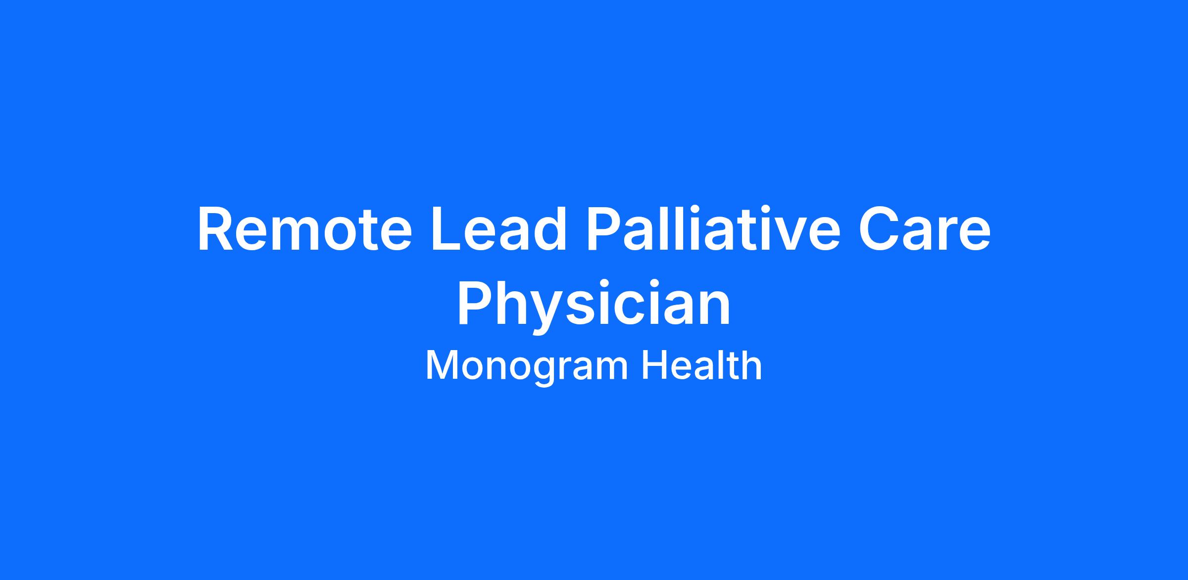 Monogram Health is seeking a full-time physician specializing in palliative care to join our team amid continued nationwide growth. This is an inâmarket, fieldâbased position requiring residence within one of our approved territories. As an inâmarket specialist, this physician will care for seriously ill patients in their community, including individuals with CKD/ESRD, COPD, and CHF. The Lead Palliative Care Physician will work closely with the Market Physician Executive (MPE) and primarily deliver care in the home.