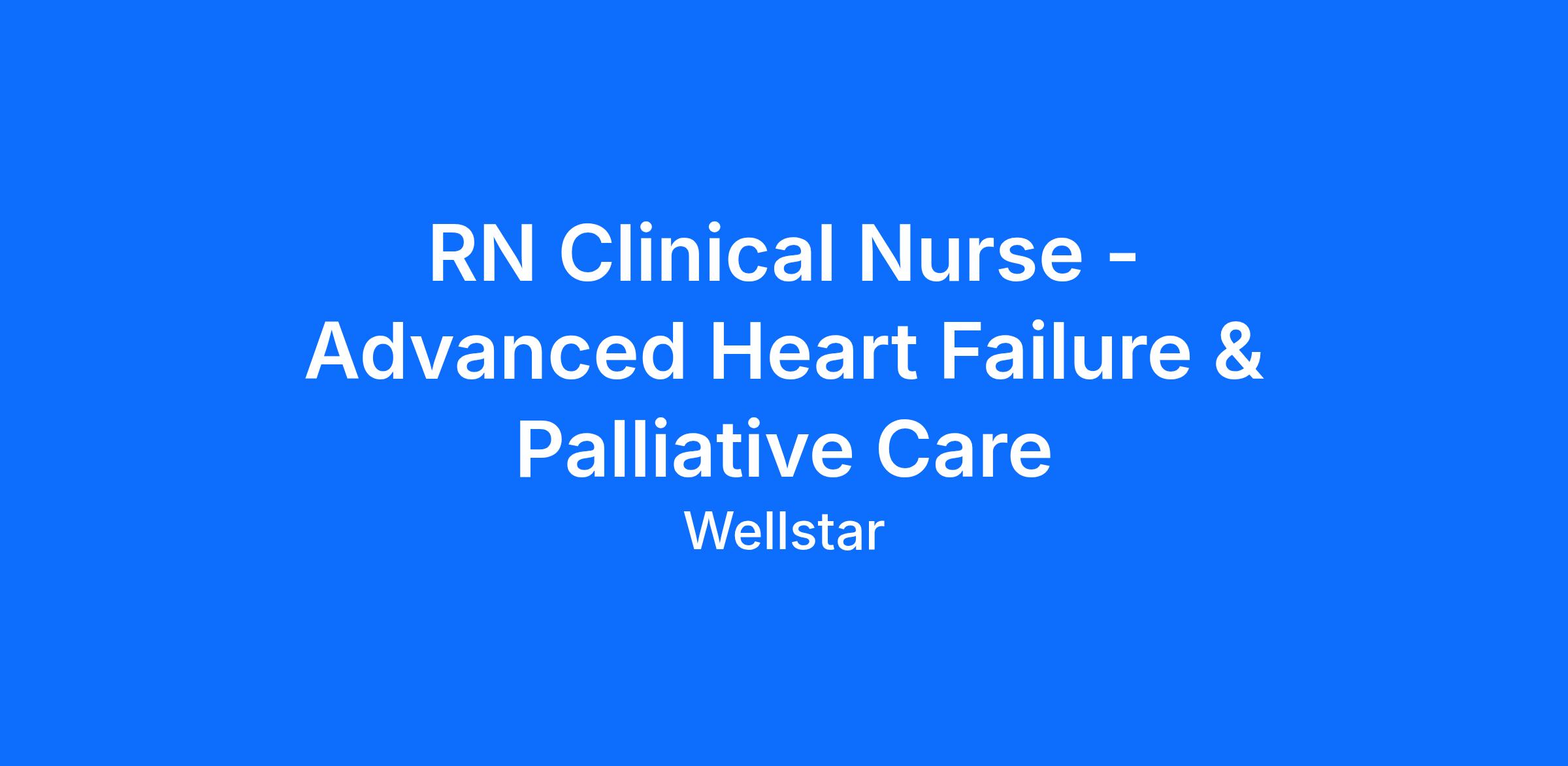 Day (United States of America)Wellstar Advanced Heart Failure & Palliative Care is a hospital outpatient department of Kennestone Hospital. Our goals are to improve clinical outcomes and quality of life for patients with heart failure while improving patient understanding and self-management of their disease process. Our care is based upon current evidence and best practice, and teamwork and collaboration are at the core of our care model. Our clinic operates Monday-Friday and is closed on weekends and major holidays. The clinical nurse position provides direct patient care for heart failure/LVAD/palliative patients, including rooming, vital signs, physical assessment, phlebotomy, medication administration, EKG, 6-minute-walk tests, and patient education. The position also involves telephone/EPIC inbasket triage, working with social workers and nurse navigators to facilitate patient care coordination, and delegating/supervising care provided by non-licensed staff.