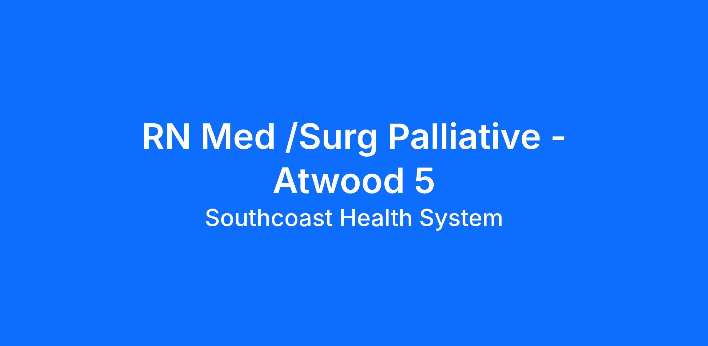 Atwood 5 is a 43 bed Medical/Surgical nursing unit. The patient population consists of adults and geriatrics with muti-system problems and diagnoses with some patients requiring surgical intervention. Atwood 5 specializes in the care of the Oncology and Palliative Care patients. Atwood 5 provides a wonderful foundation for solidifying your RN skills that can lead to many career opportunities at Southcoast!