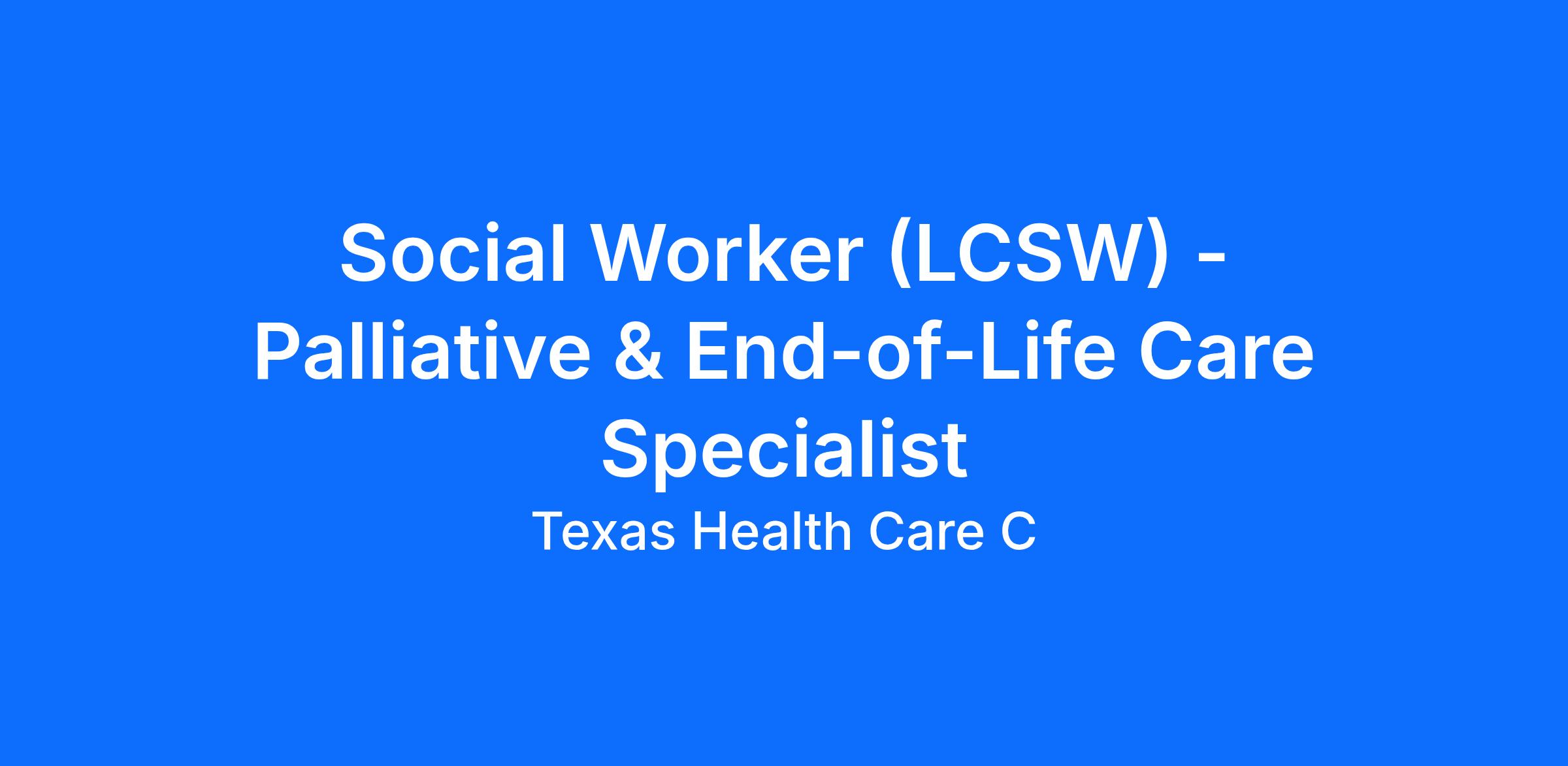 The Licensed Clinical Social Worker (LCSW) provides specialized psychosocial support to patients with chronic, serious, and terminal illness and their caregivers, with a primary focus on end-of-life conversations, goals-of-care discussions, and family support throughout the illness trajectory. This role works closely with an interdisciplinary team to ensure patient care aligns with individual values, promotes dignity, and supports both patients and caregivers during advanced illness.