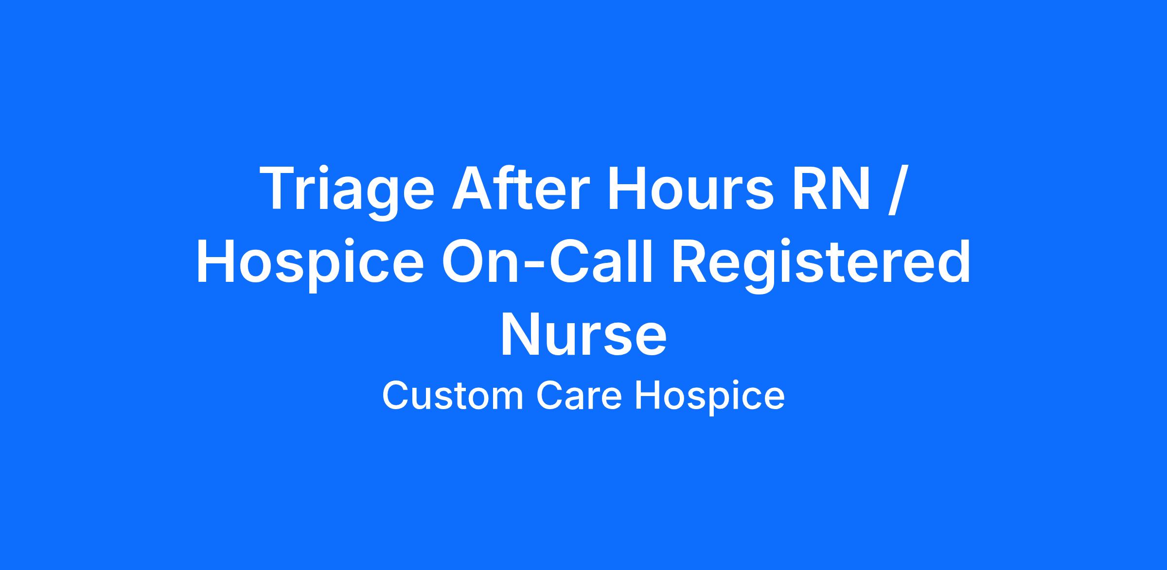 Custom Care Hospice, an exemplary organization known for its core values of Customer's Second, Accountability, Passion for Learning, Love One Another, Intelligent Risk, Celebration, and Ownership (CAPLICO), is currently recruiting for a Triage After Hours RN / Hospice On-Call Registered Nurse in the Dallas area. Join our hospice's after-hours nursing team and become a part of our caring and supportive family.
